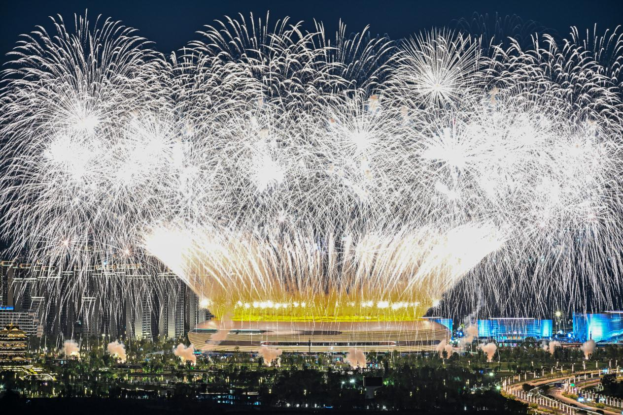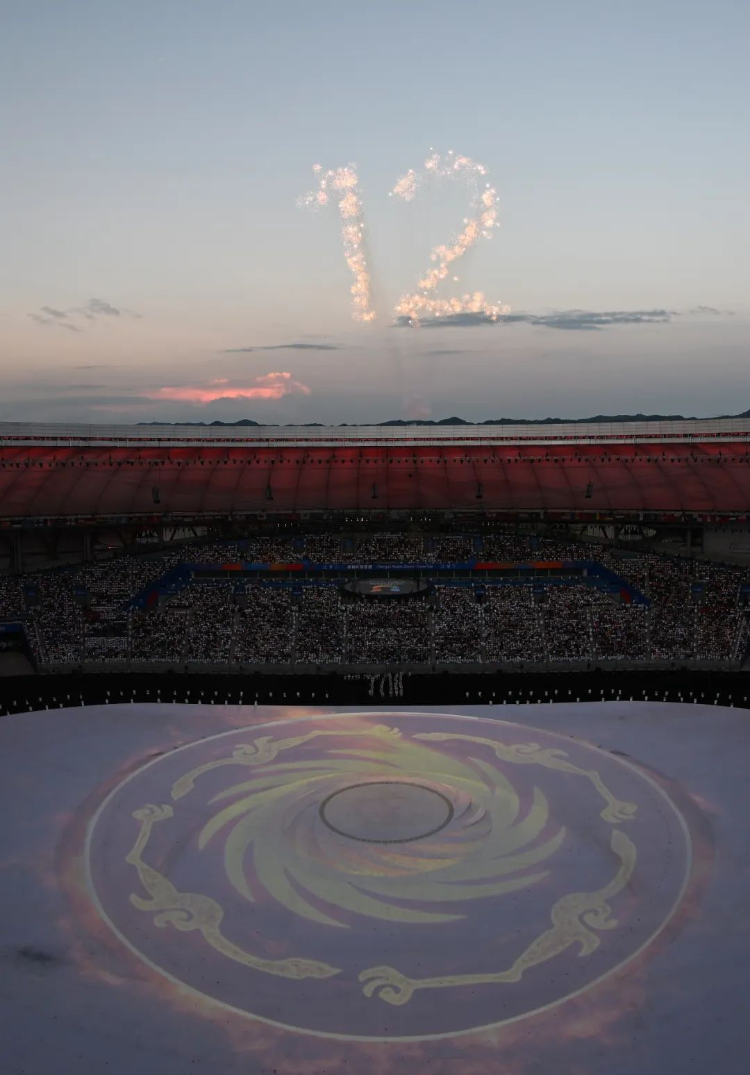 “太阳神鸟”在主体育场上空熠熠生辉。作为在成都金沙遗址出土的文物,它不仅是中国文化遗产的标志,也是中国人自古以来昂扬向上、追求光明的精神象征。