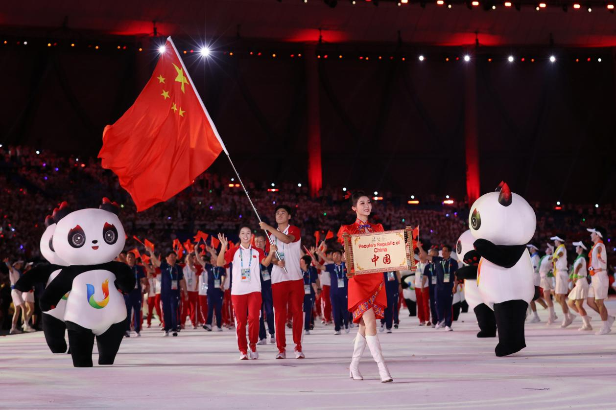 21时,在歌曲《茉莉花》的音乐声中,两名即将参加成都大运会比赛项目的运动员郭涵煜和胡朕卓担任旗手,引领530多人组成的中国大学生体育代表团,身着红白两色搭配的服饰缓缓入场,跳跃的中国红让现场掌声如潮。
