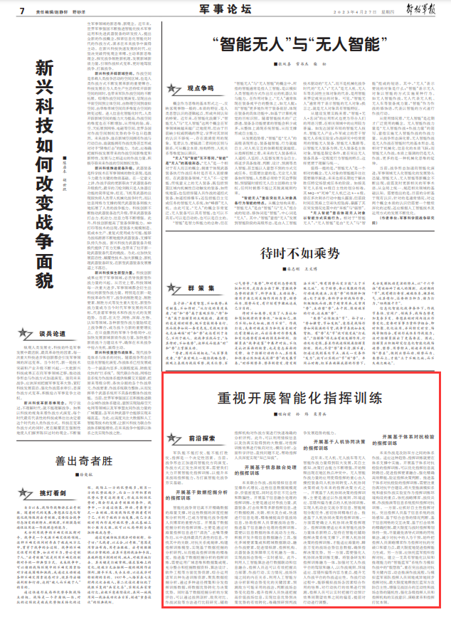 军队能不能打仗、能不能打胜仗,指挥是一个决定性因素。当前,战争形态正加速向智能化方向演变,作战方式正发生深刻变革,需要我们大力开展智能化指挥训练,以提升未来战场指挥能力,为打赢智能化战争夯实基础。