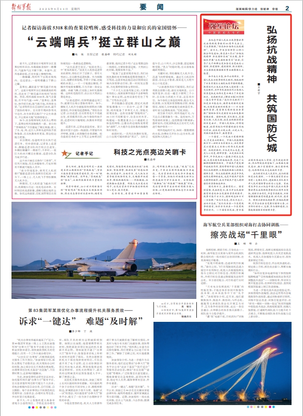 在纪念中国人民抗日战争暨世界反法西斯战争胜利80周年大会上,习主席强调,“传承和弘扬伟大抗战精神”。前不久,中央宣传部等12部门联合印发通知,要求在9月以“弘扬抗战精神 共筑国防长城”为主题,集中组织开展“全民国防教育月”活动,引导广大干部群众更加坚定自觉地关心国防、热爱国防、建设国防、保卫国防,为全面推进强国强军事业凝聚强大正能量。