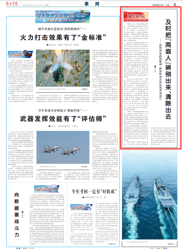 辨别“两面人”是前提,清除“两面人”才是目的。各级应严格落实军队好干部标准,严把政治关、廉洁关、形象关,决不能让劣币驱逐良币,决不能让那些政治投机者、行动两面派、道德伪君子的图谋得逞。对于甄别出的“两面人”,发现一起、查处一起,绝不姑息、绝不手软,坚决予以清除,消弭隐患、杜绝后患,全面肃清流毒积弊,坚决捍卫人民军队政治本色。