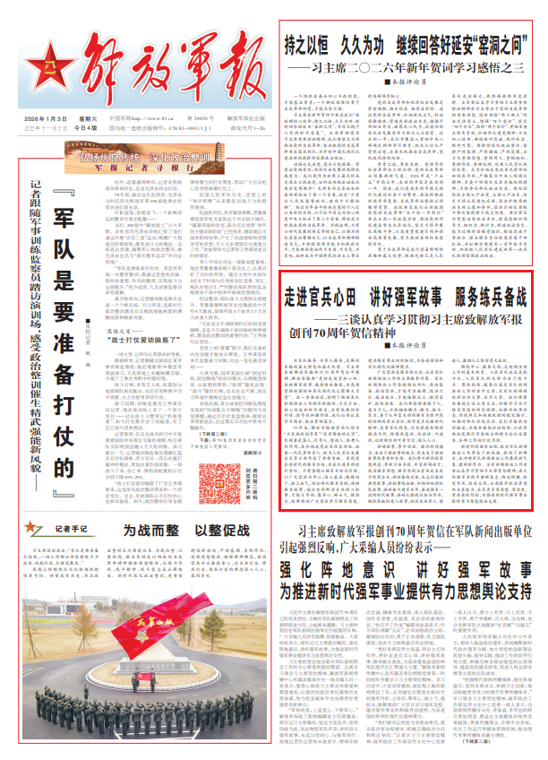 70年来,解放军报被官兵们称为“不见面的指导员”“没有围墙的大学”,发挥着武装人、引导人、塑造人、鼓舞人的作用,在弘扬我党我军优良传统、培塑一代代革命军人、助力人民军队发展壮大等方面作出了重要贡献。实现党在新时代的强军目标,是我们肩负的时代重任。只有坚持以强军目标为引领、以广大官兵为中心,深入基层,眼睛向下,接上地气,结合部队强军实践,讲好强军故事,通过宣传鲜活具体的人和事,才能立导向、聚军心、砺士气、强担当,鼓舞调动广大官兵学习强军思想、建功强军事业的积极性,为奋进国防和军队现代化凝神聚力。