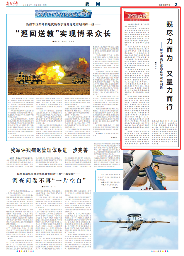 尽力而为,就是恪尽职守、实干担当,强调发挥主观能动性。尽力而为重在“尽力”,老一辈革命家谢觉哉同志曾指出:“‘十分指标,十二分措施,二十四分干劲’,任何困难,都在他们面前低头了。”事实证明,苦干实干、积极进取,事不避难、义不逃责,把力用足用到位,才能干出一番业绩。干事创业,首先要有干劲。可以说,充足的干劲是开创新时代强军事业的前提和保证。