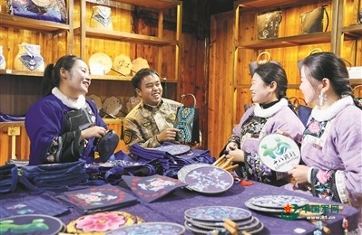 廖金海(左二)与绣娘们讨论十八洞村苗绣的传承与发展。何德华摄