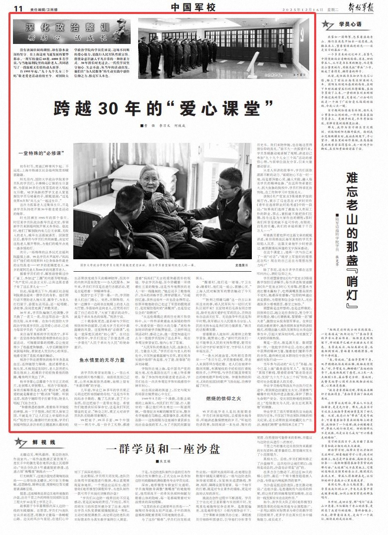 30年来,学员队编制几经调整,学员换了一茬又一茬,但这项活动一直风雨无阻、从未中断。在如今的国防大学政治学院某学员队,这项爱心活动,已成为每届学员的 “必修课”。