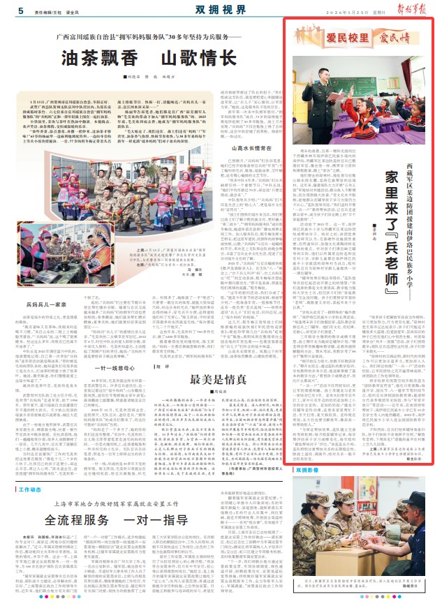 “一兵一户”活动不仅传授知识,更让军民情感相融。战士李建龙与亚米一家结对已有3年。亚米夫妇常年在外打工,家中只有年迈的奶奶亚加和上小学的孙女亚玲。亚加奶奶说:“建龙不仅辅导亚玲功课,还常来家里帮忙干活,冬天扫雪,夏天修房顶。亚玲现在常说,长大后也要当解放军,像叔叔一样帮助别人。”