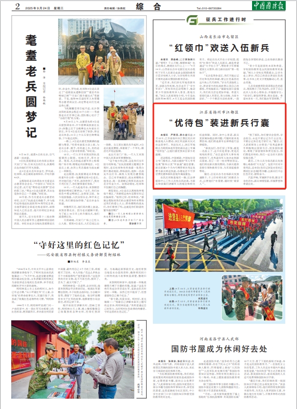 中国国防报讯 严明亮、李小龙报道:9月12日,江苏省扬州市江都区民兵训练基地人头攒动,该区欢送新兵仪式在这里举行。欢送仪式上,该区军地联合为即将奔赴军营的新兵送上专属“优待包”,让他们感受到来自家乡的温暖。