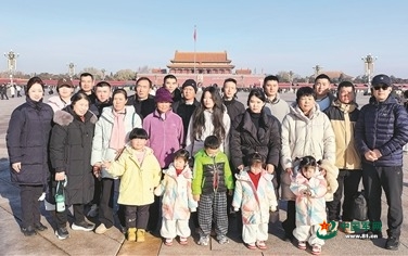 在天安门广场,边防官兵及家属合影留念。北京市朝阳区双拥办供图