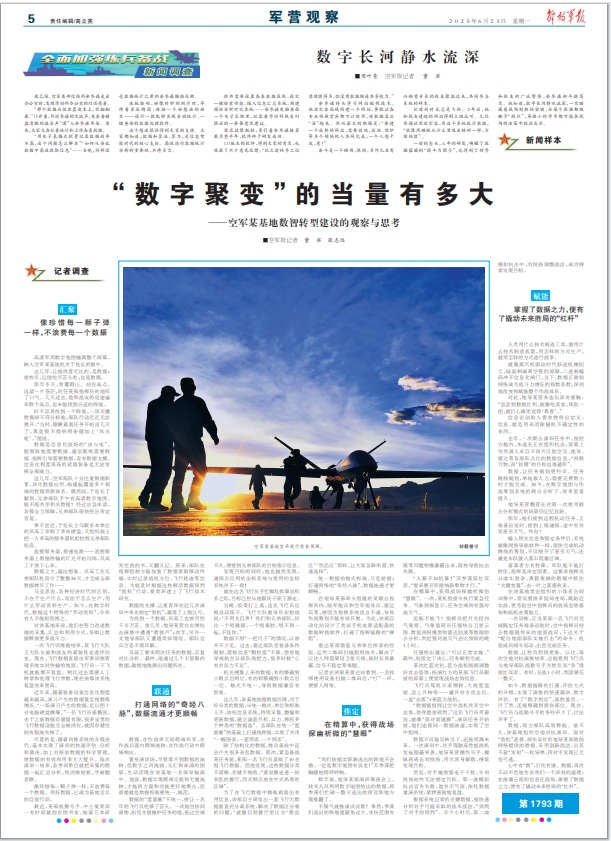 一宿的念头,三年的研发,唤醒了数据蕴藏的“战斗力因子”,也得到了领导和战友的广泛赞誉,余参谋却平静笃定。他知道,数字长河静水流深,一定暗藏着战场制胜的密钥,当每个数据都被赋予“战位”,再微小的字节都可能在战场的决策中绽放光芒。
