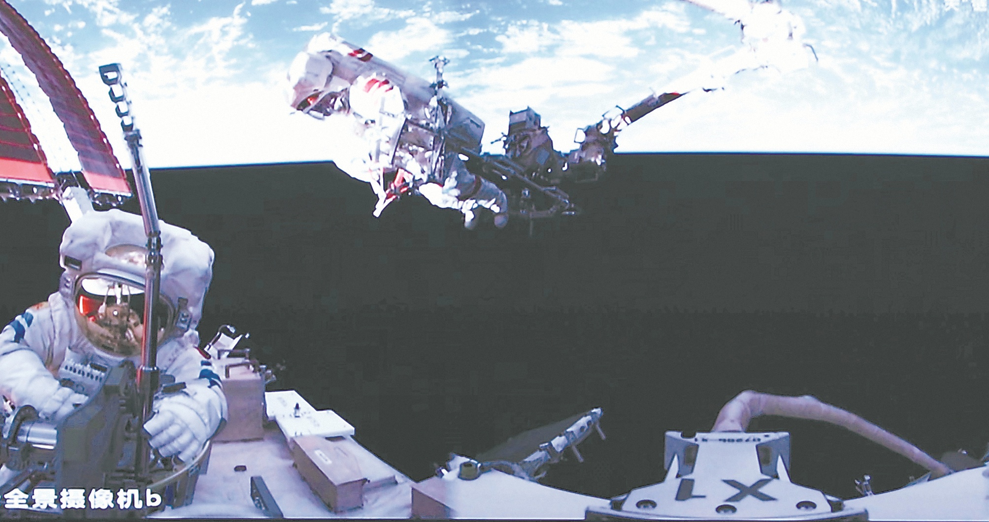 神舟二十号乘组航天员陈冬(左)与陈中瑞在空间站组合体舱外工作(资料照片)。新华社发