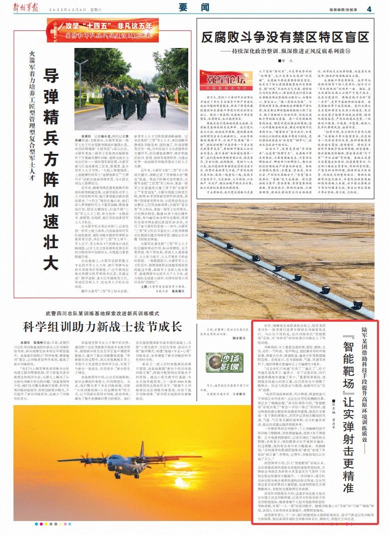 “高原环境高寒缺氧、风沙肆虐,弹道轨迹与平原地区有何差别?过去往往凭经验概略估算,现在有了精确依据。”该分队领导介绍,“智能靶场”系统实现了“射击—评估—修正”的闭环,通过特制的感应靶标和高精度传感器,能及时采集每一发子弹的弹着点,并同步记录射击瞬间的风速、气温、气压等关键环境参数,为分析偏差原因、提出改进建议提供数据参考。