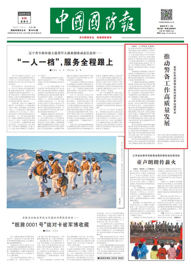 中国国防报讯 记者贾启龙、王凌硕报道:加强军事治理,优化执勤流程,完善军地机制,规范力量建设,严查涉军造假,维护官兵权益……12月5日至6日,记者在湖北省武汉市召开的省军区系统警备工作研讨会上获悉,随着职能任务不断拓展,省军区系统坚持以治理理念推动警备工作,积极构建与新时代要求相适应的面向三军、平战一体、多域协作、依法从严警备工作新模式,推动新体制下警备工作高质量发展。