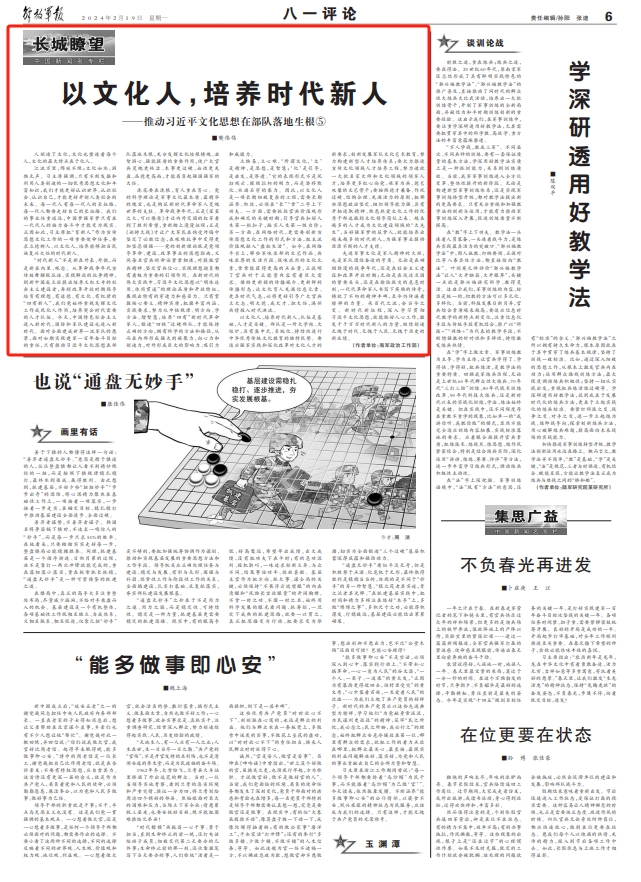 立物易,立心难。“所谓文化,‘文’是精神,是思想,是智慧;‘化’是引导,是启发,是渗透。”它的表现形式不是风扫残云、摧枯拉朽的刚力,而是潜移默化、水滴石穿的柔力。因此,以文化人是一项长期细致复杂的工程,需要长期涵养、积淀,必须在“长”“常”二字上下功夫。一方面,需要抓住官兵价值观形成和确定的关键时期,引导官兵扣好人生第一粒扣子,踩实人生第一级台阶;另一方面,在网络时代,更需要创新宣传思想文化工作的形式和方法,把主流价值观融入“虚拟生活”。如今,在网络平台上,那些军味浓郁的文艺作品、兵味浓厚的生活片段、战味浓烈的文化元素,常常能获得更高的点击量,正说明了官兵对于正能量内容有着巨大需求。借助更新颖的传播媒介、更新鲜的传播形态,让文化育人充满信息元素、更具时代气息,必将更好引导广大官兵立大志、明大德、成大才、担大任,满怀热情投入时代洪流。