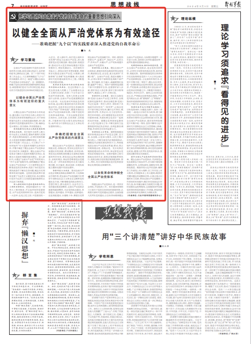 全面从严治党是新时代党的自我革命的伟大实践,是党永葆生机活力、走好新的赶考之路的必由之路。在二十届中央纪委三次全会上,习主席明确提出“九个以”的实践要求,其中之一就是“以健全全面从严治党体系为有效途径”。这一重要要求,明确了党的自我革命的思路举措和实现途径,彰显着我们党对于以科学的态度、体系化的方式推进党的自我革命的高度自觉。