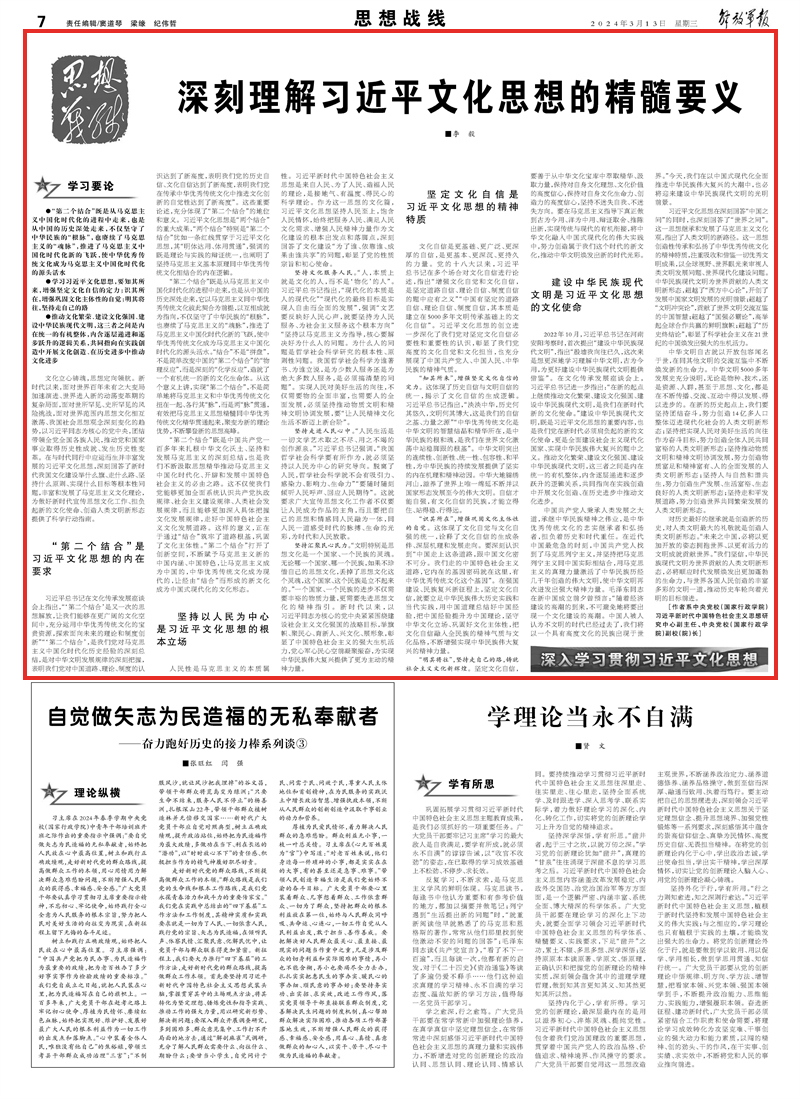 ●学习习近平文化思想,要知其所来,增强坚定文化自信的定力;识其所在,增强巩固文化主体性的自觉;明其将往,坚持走自己的路