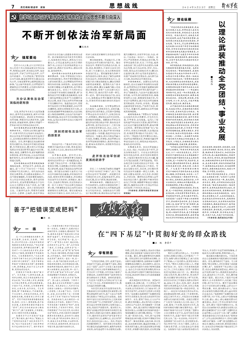 依法治军是一个复杂的系统工程,需要我们坚持政治引领,聚焦备战打仗,创新方式方法,推动依法治军向纵深发展。