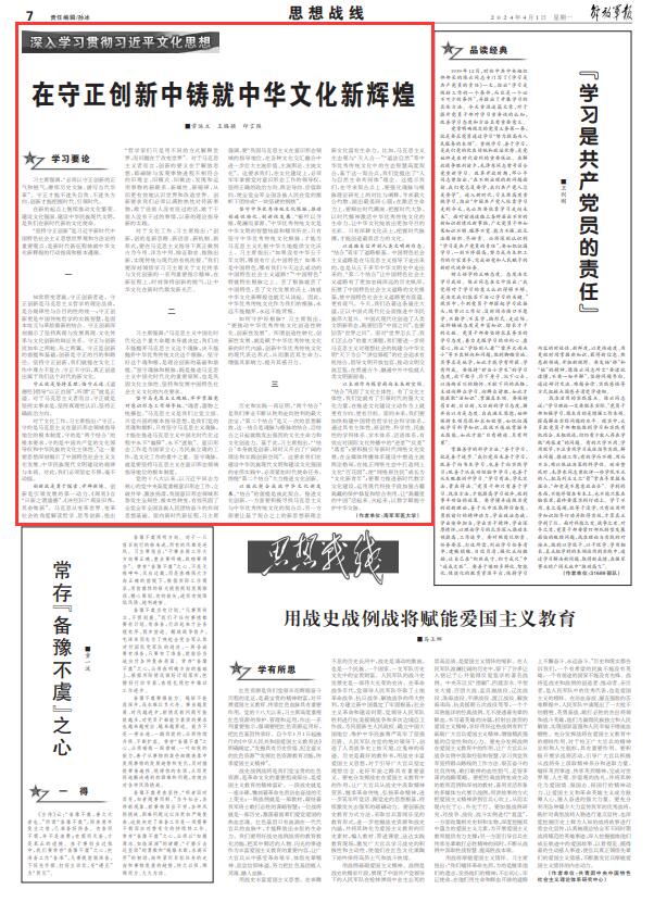 对于文化工作,习主席指出:“创新,创的是新思路、新话语、新机制、新形式,要在马克思主义指导下真正做到古为今用、洋为中用、辩证取舍、推陈出新,实现传统与现代的有机衔接。”我们要深刻领悟学习习主席关于文化传承与文化创新的一系列重要指示精神,在新征程上,时刻保持创新的锐气,让中华文化在新时代焕发新光芒。