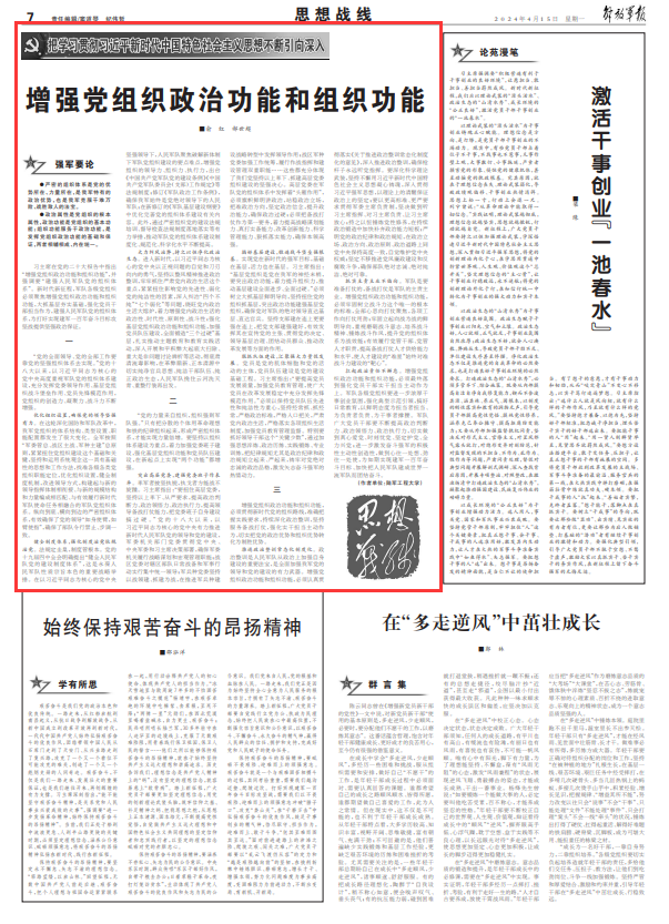 习主席在党的二十大报告中指出“增强党组织政治功能和组织功能”,并强调要“建强人民军队党的组织体系”。新时代新征程,军队各级党组织必须聚焦增强党组织政治功能和组织功能,大抓基层夯实基础,强化党员干部担当作为,建强人民军队党的组织体系,为打好实现建军一百年奋斗目标攻坚战提供坚强政治保证。