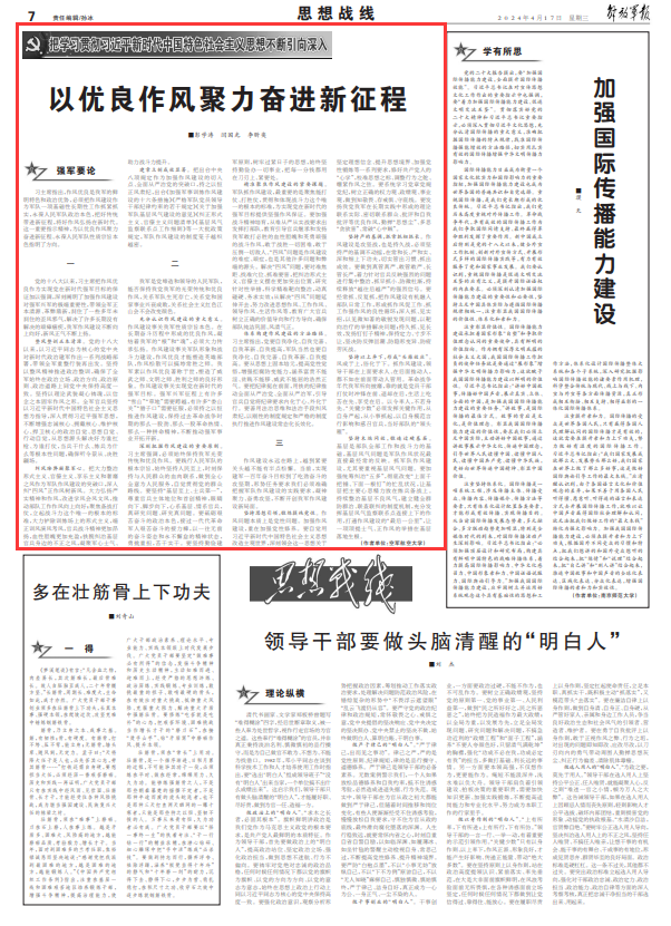 习主席指出,作风优良是我军的鲜明特色和政治优势,必须把作风建设作为军队一项基础性长期性工作抓紧抓实,永葆人民军队政治本色,把好传统带进新征程,将好作风弘扬在新时代。这一重要指示精神,为以优良作风聚力奋进新征程、永葆人民军队性质宗旨本色指明了方向。