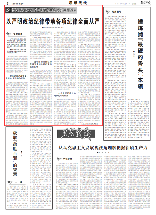 政治纪律是各级党组织和全体党员在政治方向、政治立场、政治言论、政治行为方面必须遵守的规矩。党的十八大以来,以习近平同志为核心的党中央旗帜鲜明加强党的政治建设,严明政治纪律和政治规矩,使全党团结成“一块坚硬的钢铁”。阔步新征程,我们面临风高浪急甚至惊涛骇浪的考验,必须以严明政治纪律带动各项纪律全面从严,使党和军队在铁纪锻造中更加坚强有力。