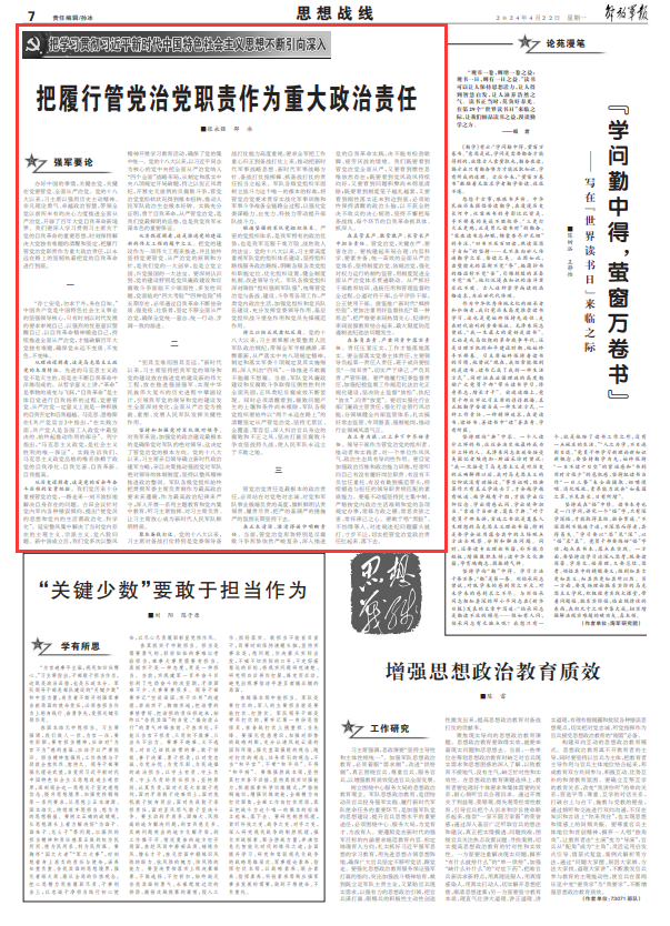 在真管真严、敢管敢严、长管长严中担当责任。管党治党,关键在严、要害在治。要构建起布局合理、内容科学、要素齐备、统一高效的全面从严治党体系,坚持制度治党、依规治党,强化对权力运行的制约监管,用制度促进全面从严治党体系贯通联动。从严抓好干部教育培训、选拔任用和管理监督的全过程,公道对待干部,公平评价干部,公正使用干部。借鉴推广新时代“枫桥经验”,更加注重用好监督执纪“第一种形态”,把严格要求同热情关心、纪律约束同说服教育结合起来,最大限度防范遏制违纪违法问题发生。