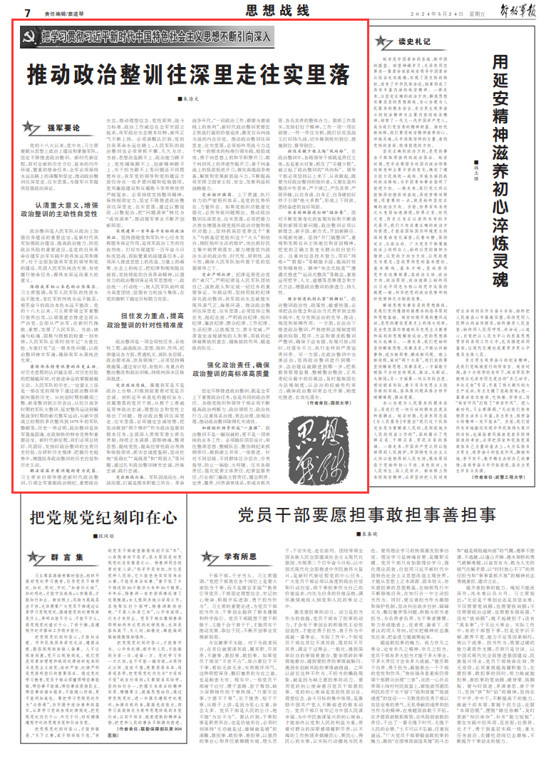 政治整训是一项全局性任务、系统性工程,涵盖政治、思想、组织、作风、纪律建设各方面,贯通机关、部队各层级,政治要求高、涉及领域广,必须坚持精准施策,通过有计划、有组织、有重点的整治整改和政治训练,持续向深水区纵深挺进。