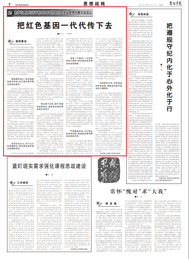 把红色基因一代代传下去,必须进一步夯实理想信念的思想根基,铸牢全体官兵的精神支柱。要着眼于坚定社会主义、共产主义的理想信念,大力发扬革命理想高于天的优良传统,弘扬革命先辈为理想信念不懈奋斗的崇高精神,强化中国特色社会主义道路自信、理论自信、制度自信、文化自信,引导官兵自觉做共产主义远大理想和中国特色社会主义共同理想的坚定信仰者和忠实实践者。