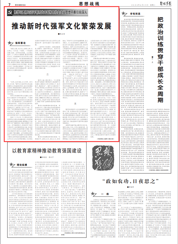 “国民之魂,文以化之;国家之神,文以铸之。”文化是一个国家、一个民族的灵魂,也是一支军队的灵魂。习主席在党的二十大报告中强调要“繁荣发展强军文化”,对加强新时代我军军事文化建设发出了动员令。我们要紧紧围绕党在新时代的强军目标,繁荣发展具有我军特色、彰显时代精神、支撑打赢制胜的强军文化,激励官兵勇立时代潮头、勇当时代尖兵,为如期实现建军一百年奋斗目标、加快把人民军队建成世界一流军队提供有力支撑和坚强保证。