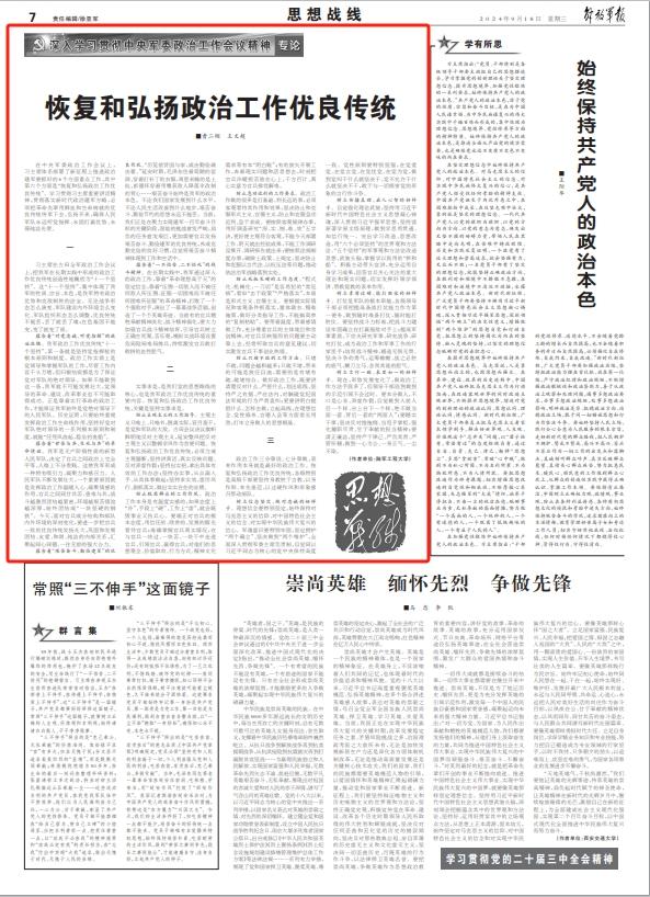 在中央军委政治工作会议上,习主席体系部署了新征程上推进政治建军要抓好的6个方面重点工作,其中第六个方面是“恢复和弘扬政治工作优良传统”。学习贯彻习主席重要讲话精神,贯彻落实新时代政治建军方略,必须把革命先辈用鲜血和生命铸就的优良传统传承下去、弘扬开来,确保人民军队永远听党指挥、永固打赢优势、永葆纯洁光荣。