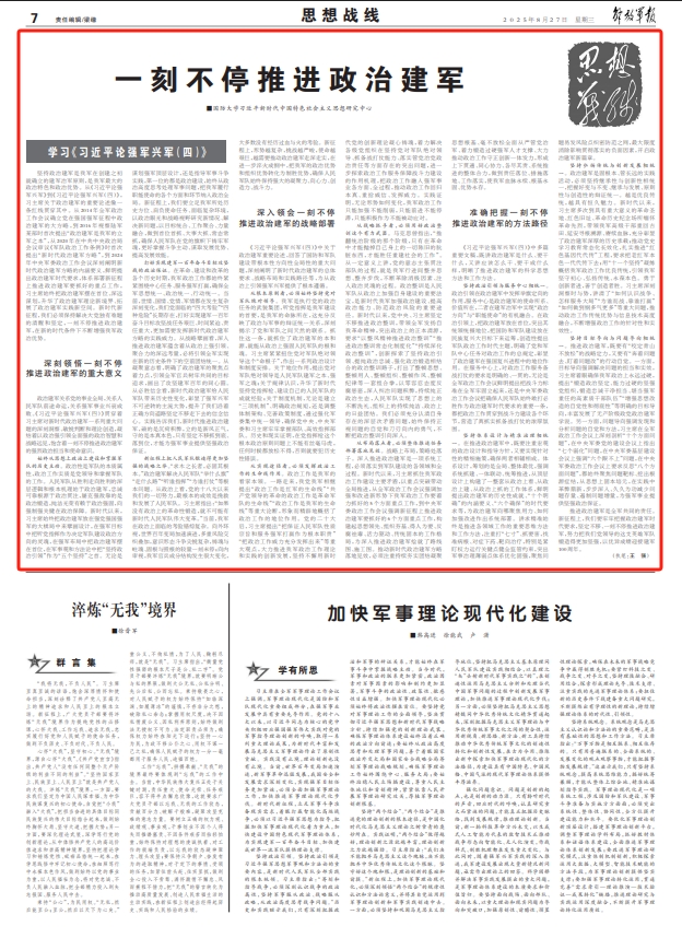 坚持政治建军是我军在创建之初就确立的建军治军原则,是我军最大的政治特色和政治优势。从《习近平论强军兴军》到《习近平论强军兴军(四)》,习主席关于政治建军的重要论述像一条红线贯穿其中。从2014年全军政治工作会议确立党在强国强军征程中政治建军的大方略,到2016年视察陆军某部时首次提出“政治建军是我军的立军之本”,从2020年在中共中央政治局会议审议《军队政治工作条例》时首次提出“新时代政治建军方略”,到2024年中央军委政治工作会议深刻阐明新时代政治建军方略的内涵要义,鲜明提出政治建军时代要求,体系部署新征程上推进政治建军要抓好的重点工作,习主席始终把政治建军摆在首位、深远谋划,升华了政治建军理论新境界、拓展了政治建军实践新空间。新时代新征程,我们必须保持解决大党独有难题的清醒和坚定,一刻不停推进政治建军,在新的时代条件下不断增强我军政治优势。