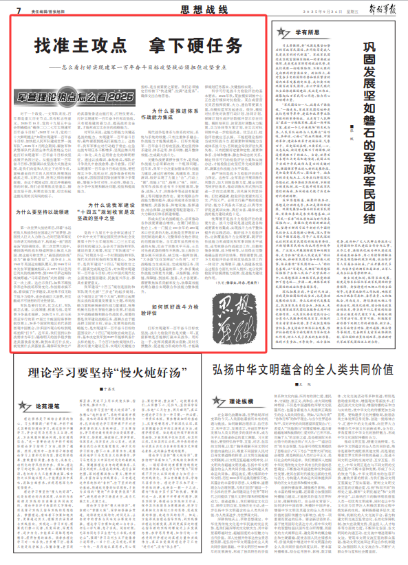 对于一个政党、一支军队来说,百年都是重大历史节点,具有标志性意义。2020年10月,党的十九届五中全会明确提出“确保二〇二七年实现建军百年奋斗目标”;2022年10月,党的二十大鲜明提出“如期实现建军一百年奋斗目标,加快把人民军队建成世界一流军队”;2025年3月两会期间,解放军和武警部队代表团全体代表围绕全力以赴打好实现建军一百年奋斗目标攻坚战展开热烈讨论。从提出建军一百年奋斗目标,到强调以攻坚战方式推进实现,是我们向党和人民立下的军令状,意味着走向百年的人民军队将展现出威武之师、文明之师、胜利之师的崭新面貌。在这个爬坡过坎、收官冲刺最吃劲的时候,我们必须聚焦攻坚重点,铆足攻坚干劲,积聚攻坚力量,切实担起这副光荣的沉甸甸的担子。