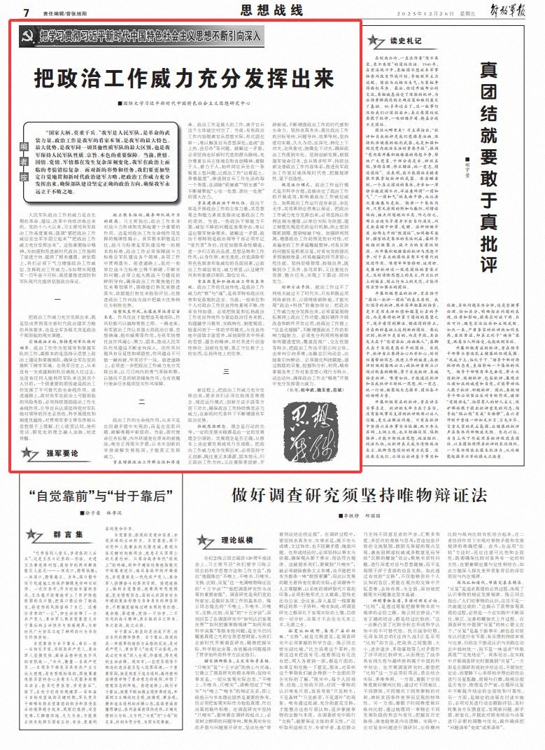 把政治工作威力充分发挥出来,既是坚决贯彻落实新时代政治建军方略的具体要求,也是全军各级尤其是政治干部面临的现实课题。