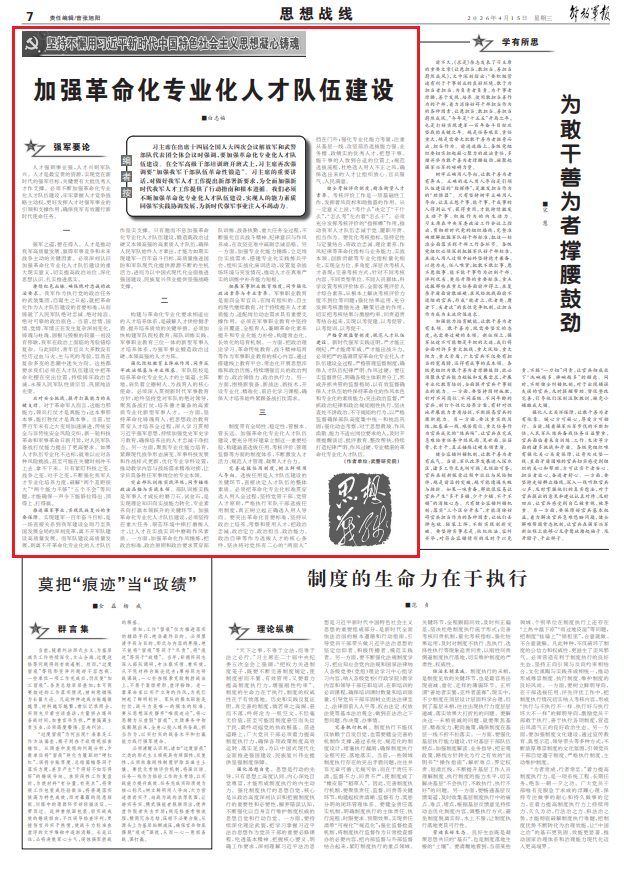 推进强军事业、实现民族复兴的重要保障。实现建军一百年奋斗目标,是一场直接关系到我军建设全局乃至我国发展全局的深刻变革,离不开军队建设高质量发展。而军队建设高质量发展,则离不开革命化专业化的人才队伍作坚实支撑。只有驰而不息加强革命化专业化人才队伍建设,锻造既政治过硬又本领高强的高素质人才队伍,确保人民军队始终人才辈出,才能为如期实现建军一百年奋斗目标、高质量推进国防和军队现代化提供源源不断的生机活力,进而为以中国式现代化全面推进强国建设、民族复兴伟业提供坚强战略支撑。