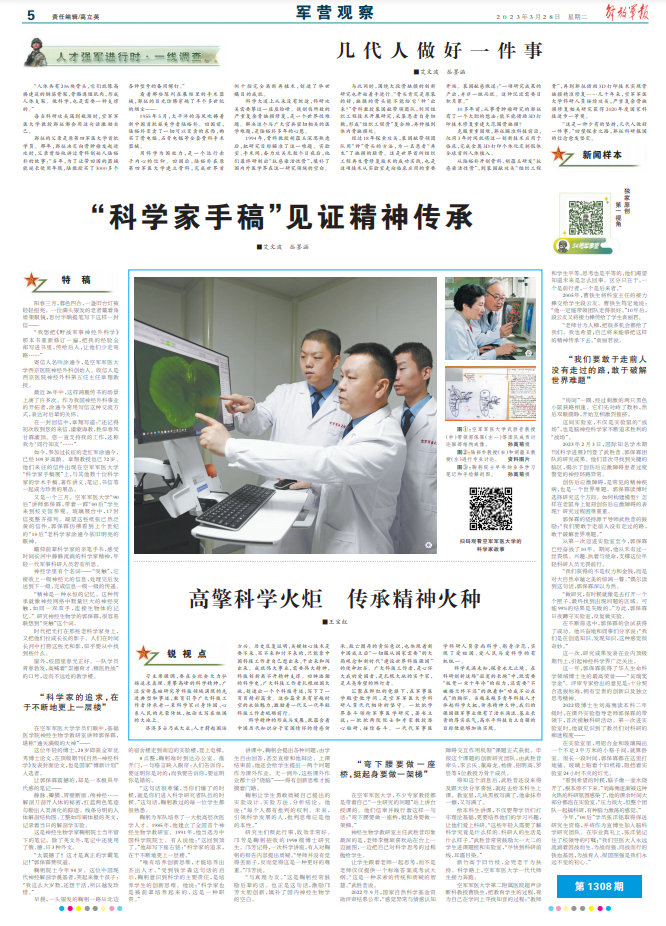 科学充满未知,探索永无止境。在科研创新这场“寂寞的长跑”中,既需要“板凳一坐十年冷”的毅力,还需要“不破楼兰终不还”的执着和“功成不必在我”的胸怀。当越来越多青年科技人才举起科学火把,传承精神火种,我们的强国强军事业便有了活水涌流、基业长青的厚实底气,高水平科技自立自强的目标便能够加快实现。