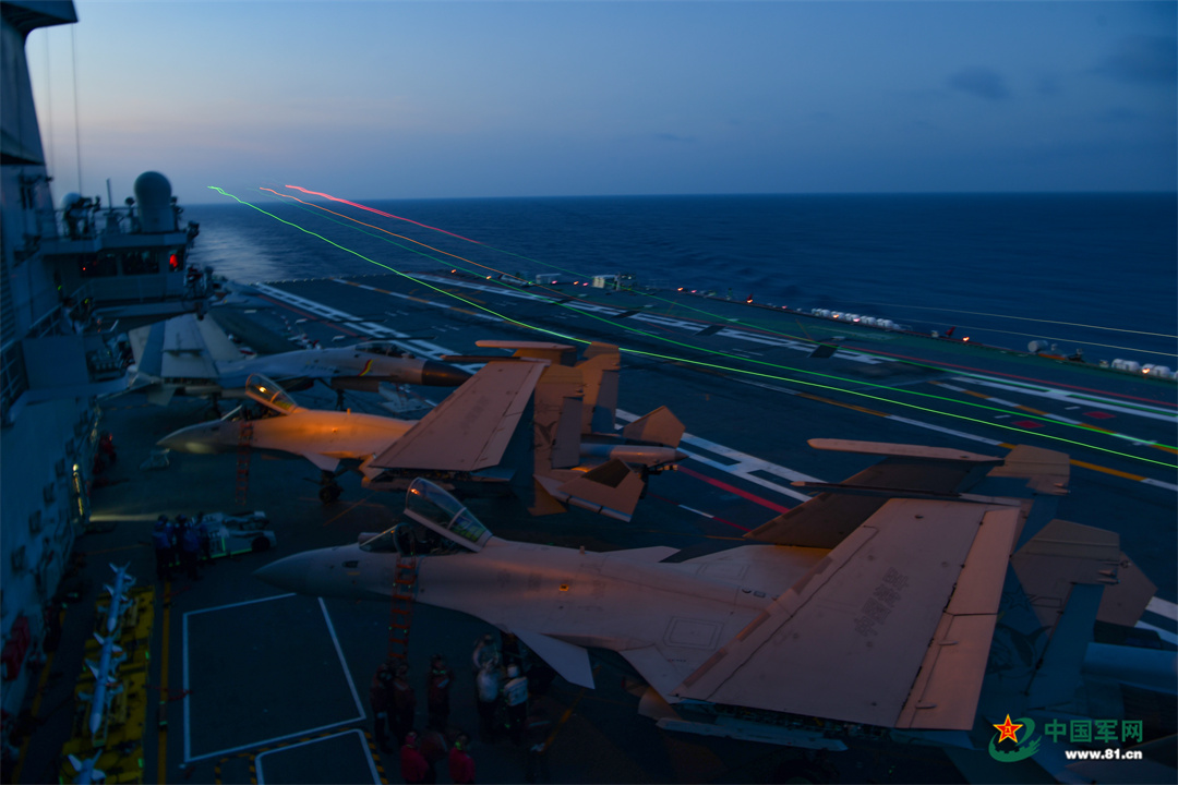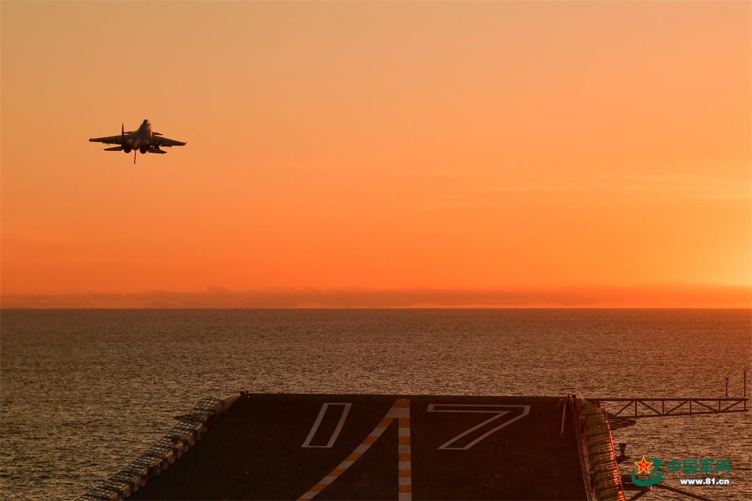 伴随最后一缕金色霞光洒向海面,歼-15舰载机完成当日放飞任务,即将返航。此刻,军士张忠杰和他的战友们已在各个阻拦点位准备就绪。