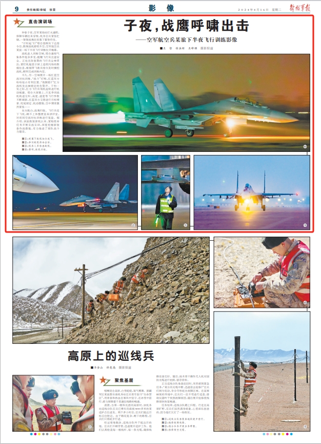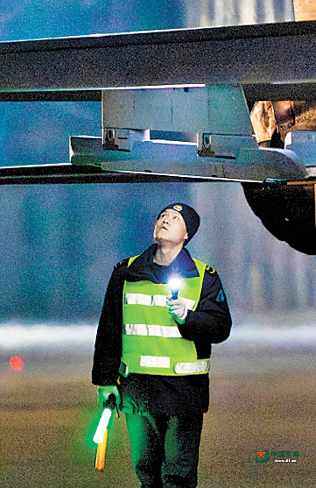 仲春子夜,空军某场站灯火通明,保障车辆往来穿梭,机务官兵紧张忙碌,一架架战鹰在夜幕下蓄势待发。