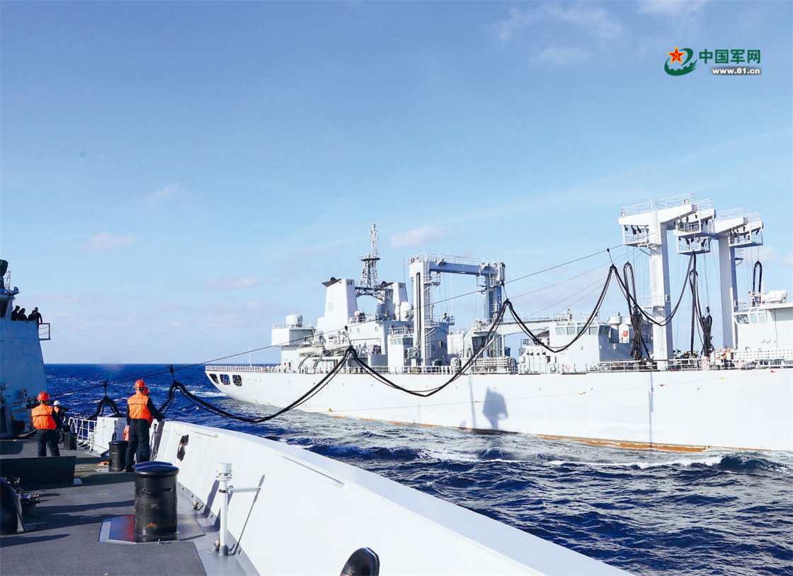 海军某基地舰艇编队开展海上补给训练