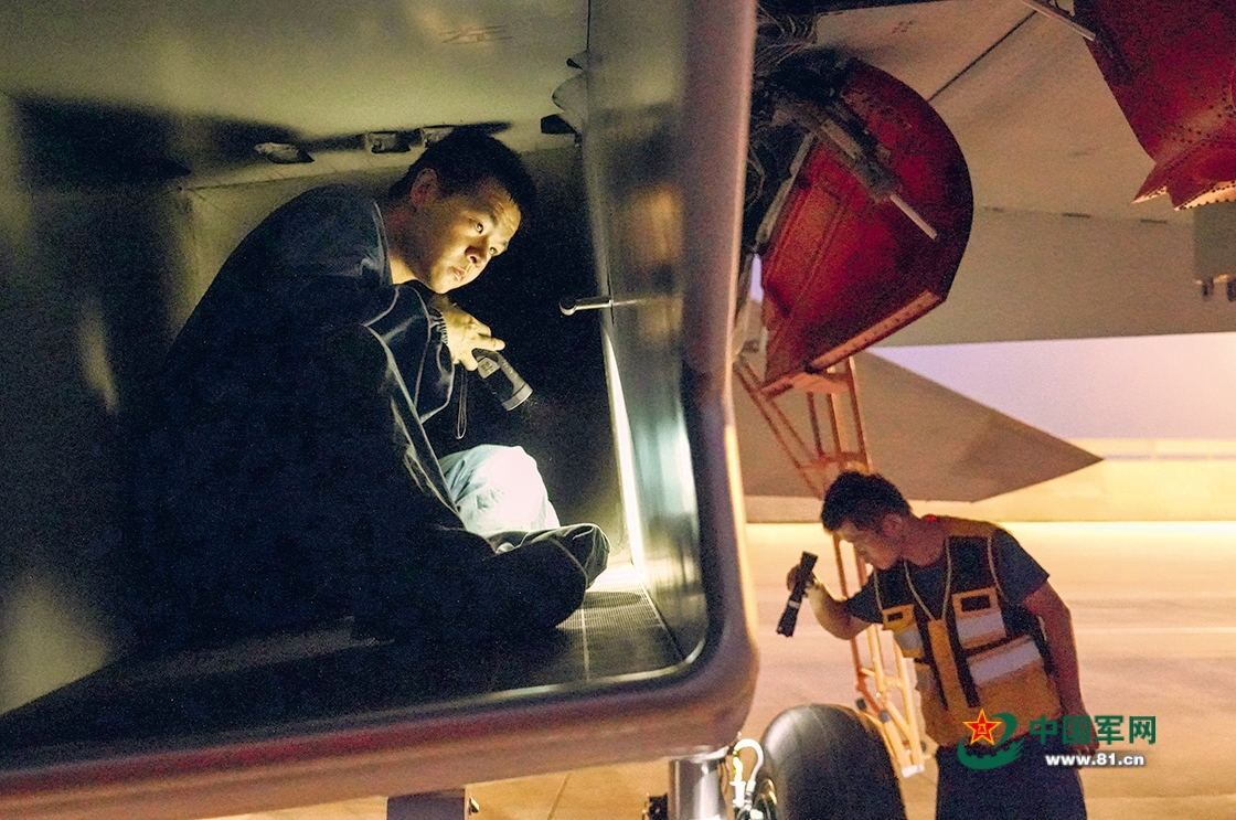 机务官兵快速进入机库,检查飞机,为飞机补充氮气氧气、加注燃油、加载任务数据……官兵穿梭忙碌,一丝不苟地进行飞行训练准备。