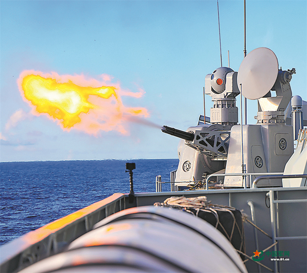 硝烟未散,对海突击训练接续展开。各舰高速机动,占领有利攻击阵位。在编队统一指挥下,各舰主炮对“敌”水面目标发起火力打击。