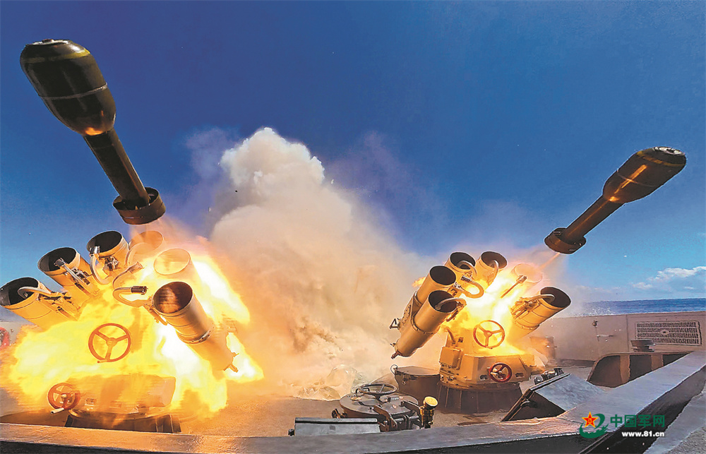 不多时,某护卫舰率先锁定目标。“发射!”指挥员果断下达攻击指令,数枚火箭深弹脱膛而出扑向目标,海面激起数米高的水柱。