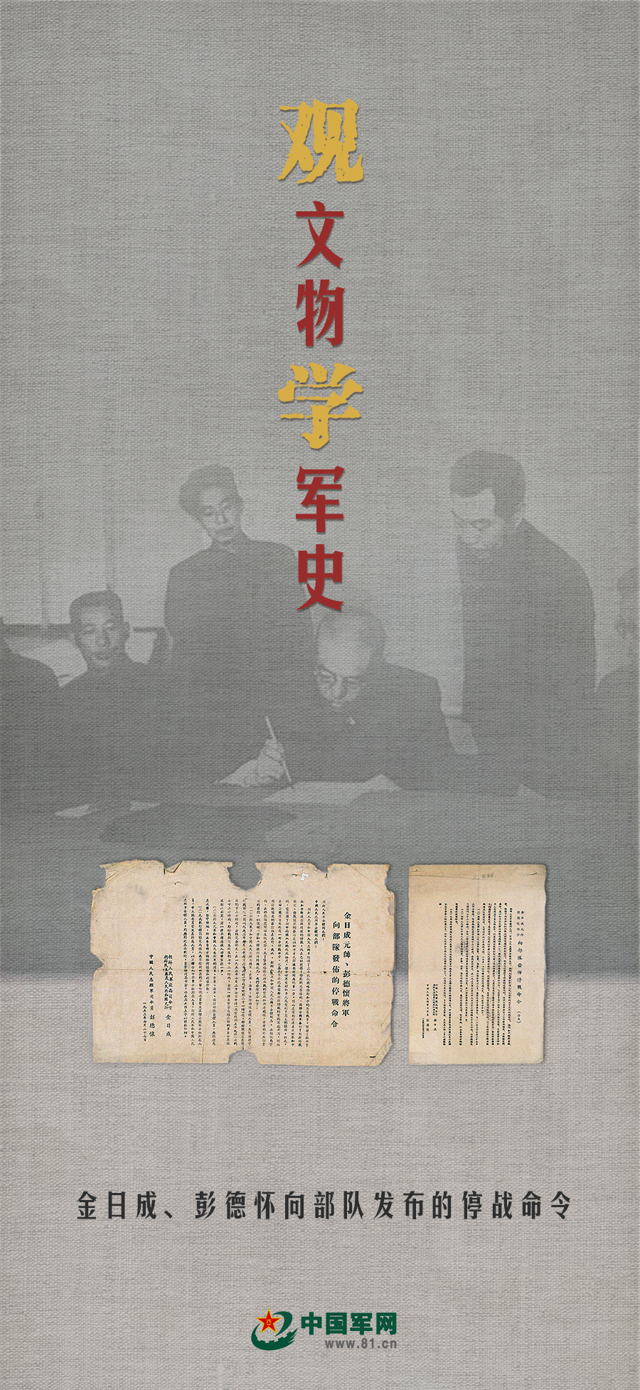 1953年7月27日,朝鲜战争参加各方在板门店举行停战协定签字仪式。签字当天,朝鲜人民军最高司令官金日成和中国人民志愿军司令员彭德怀联名向朝鲜人民军和中国人民志愿军发布停战命令。命令主要内容是:即日晚10时起完全停止在朝鲜的一切敌对行为;一切军事力量、供应和装备将于停战协定生效后72小时内从非军事区撤出。