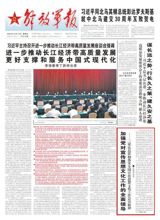 “各级党委(党组)要把做好宣传思想文化工作作为重大政治责任扛在肩上,确保党中央关于文化建设的决策部署落到实处。”习主席近日对宣传思想文化工作作出重要指示,强调了各级党委的政治责任和领导责任,对宣传思想文化战线提出了明确要求,深刻阐明了新时代宣传思想文化工作的力量所在和优势所在,为不断开创新时代宣传思想文化工作新局面提供了政治保证和组织保证。全军必须深入学习领会、坚决贯彻落实。