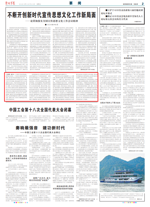 宣传思想文化工作的生命力在于号准时代脉搏,在于不断改进创新。加强党对宣传思想文化工作的全面领导,必须要勇于改革创新。全军要解放思想、更新观念,以鲜活的思想教育理念、舆论引导理念、文化发展理念、阵地建设理念等,为军队宣传思想文化工作注入生机活力;要直面新挑战、解决新问题,结合信息化飞速发展,军队现代化加快,官兵成分结构不断变化,加强研究探索,在解决问题中拓展视野、把握规律,不断增强军队宣传思想文化工作的主动性针对性实效性;要创造新方法、丰富新手段,立足网络时代,深入研究把握官兵思想行为特点,以技术创新赋能内容创新、形式创新、传播创新,把军队宣传思想文化工作搞得更富时代感吸引力。