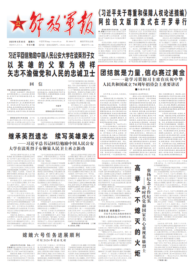 “团结就是力量,信心赛过黄金。”庆祝中华人民共和国成立74周年招待会9月28日晚在人民大会堂举行,习主席出席招待会并发表重要讲话。习主席的重要讲话,站在时代发展和战略全局的高度,礼赞新中国取得的巨大成就,满怀豪情展望美好未来,对以中国式现代化全面推进强国建设、民族复兴提出明确要求,必将进一步激励全党全军全国各族人民坚定信心、振奋精神、团结奋斗,为实现第二个百年奋斗目标、实现中国梦强军梦作出新的更大贡献。