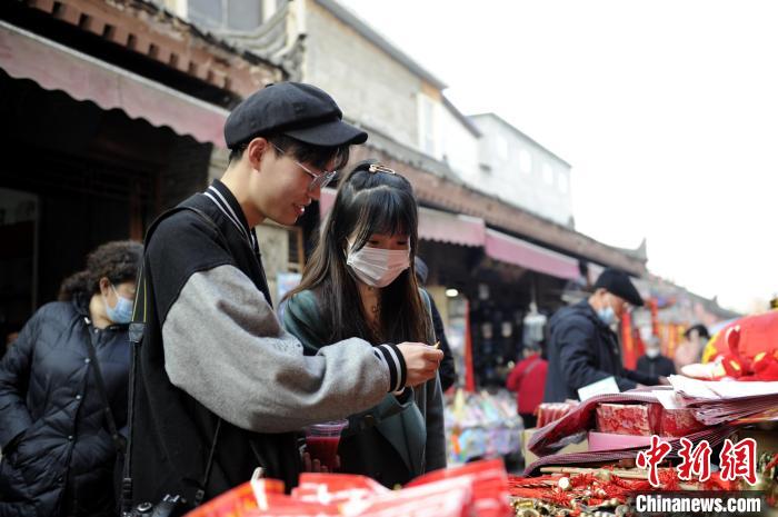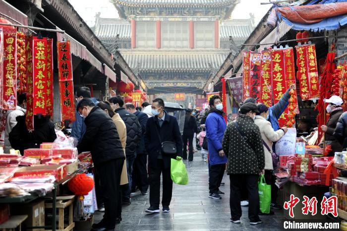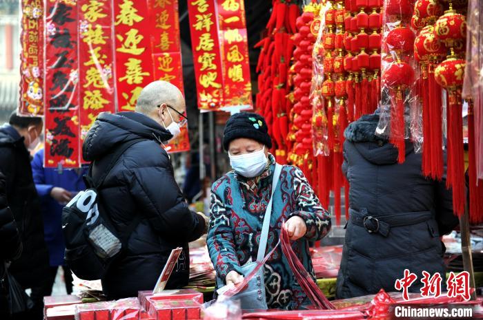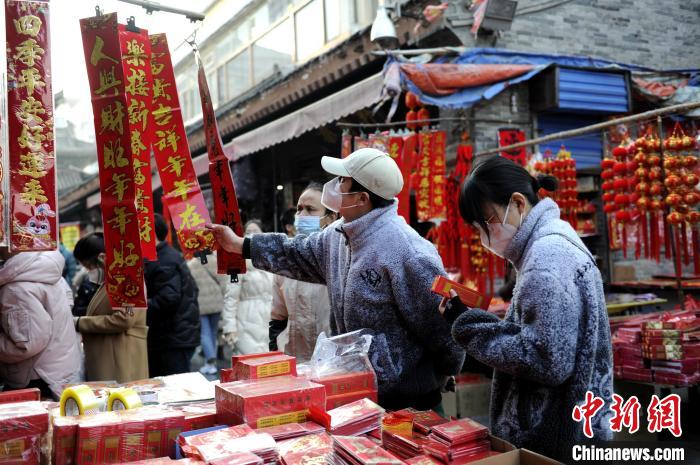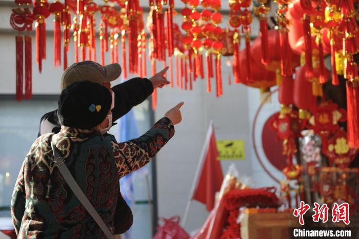 临近中国农历兔年春节,年味儿越来越浓,西安都城隍庙门庭若市,许多市民纷纷走上街头,驻足在摊位前,挑选心仪的新春饰品,火红的灯笼、喜庆的春联和中国结等传统饰物为新年增添了浓浓的年味儿。