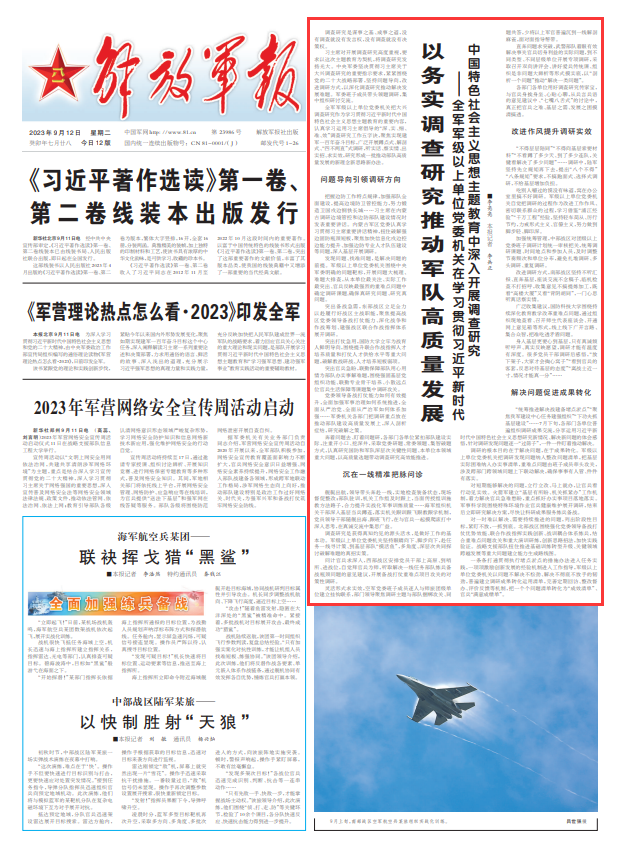 习主席对开展调查研究高度重视,要求以这次主题教育为契机,将调查研究发扬光大。中央军委坚决贯彻习主席关于大兴调查研究的重要指示要求,紧紧围绕党的二十大战略部署,坚持问题导向,改进调研方式,以深化调查研究推动解决发展难题。军委班子成员带头领题调研,集中组织研讨交流。