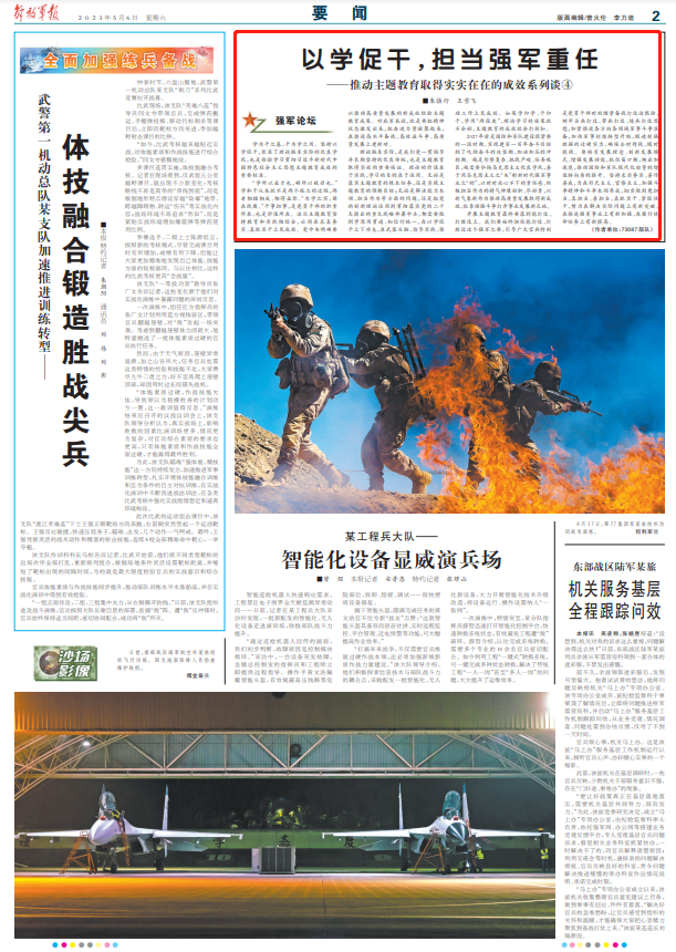 “学所以益才也,砺所以致刃也。”学和干从来就不是两个孤立的过程,两者相辅相成、相得益彰。“为学之实,固在践履。”干事担事,是党员干部的职责所在,也是价值所在。这次主题教育坚持教育和实践相结合,必须在求真务实、真抓实干上见成效。党中央明确要以推动高质量发展的新成效检验主题教育成果。对我军来说,就是要把精神状态激发出来,把奋进力量凝聚起来,在推进高水平备战、高效益斗争、高质量发展上建新功。