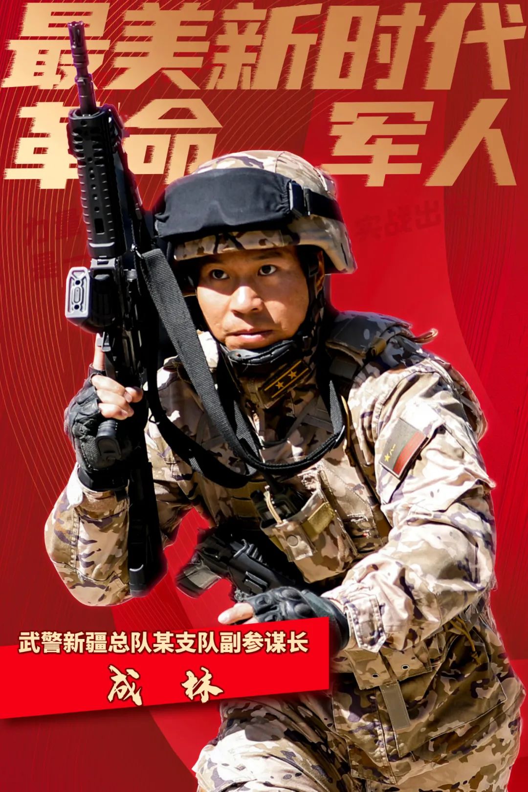 成林,武警新疆总队某支队副参谋长,先后参加10余次重大反恐维稳行动;28次比武竞赛中,他23次摘金夺银,带队取得11项优异排名,在国际军事赛场打出赫赫威名;从军22载,他先后荣立一等功1次、二等功2次、三等功3次,被中央军委表彰为“全军爱军精武标兵”,被武警部队表彰为“中国武警忠诚卫士”。