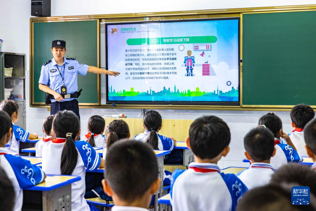 9月11日,贵州省安顺市公安局西秀分局民警在安顺市第七小学为学生讲解不良上网习惯的危害。新华社发(陈熙摄)