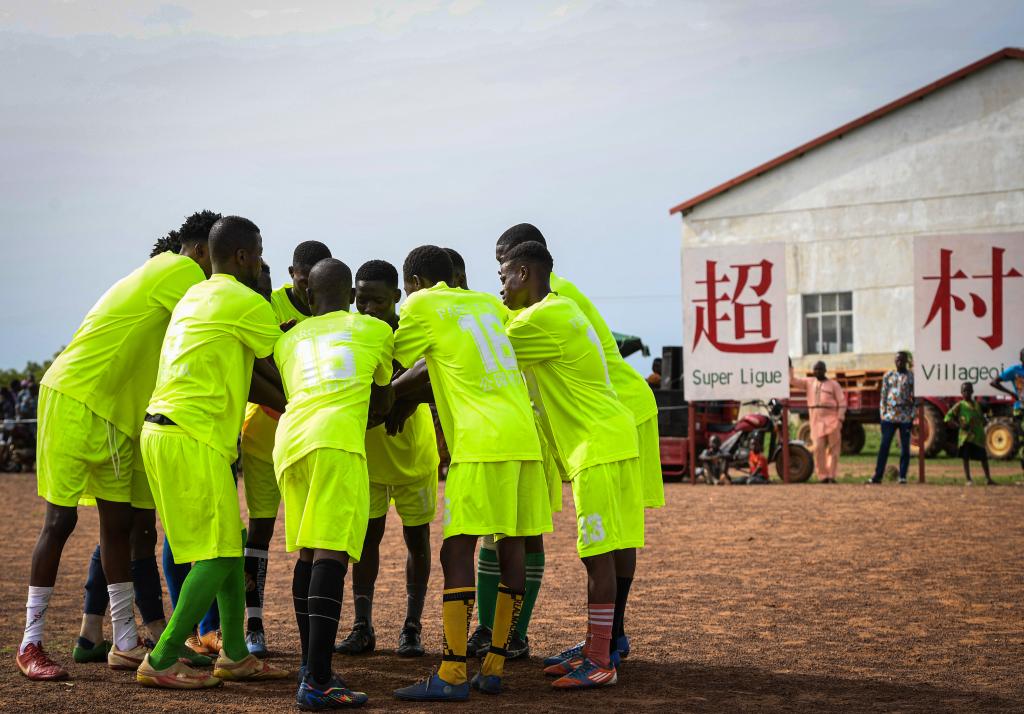 2024年5月25日,在贝宁帕拉库市美丽城村,公园村7队球员在“村超”决赛前鼓劲。新华社记者李亚辉摄